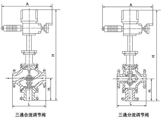 ZAZQ、ZAZX系列電動三通合流、分流調節閥產品口徑由25mm至200mm,公稱壓力有1.0、1.6、4.0、6.4MPa,溫度范圍-60℃至450℃,控制信號為0~10或4~20mA.DC。配用不同的執行機構可分為普通型和電子型兩種。