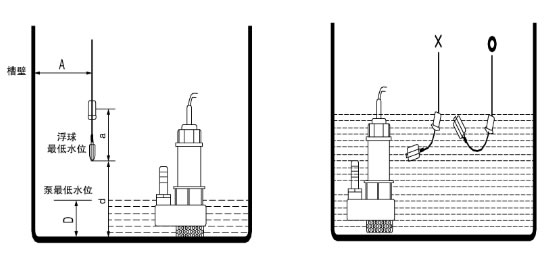 2、浮球動作長度a須***小于槽壁與電纜距離A,浮球控制***低水位d須***大于水位D。 見圖: