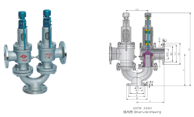 A38Y、A43H、A37H系列雙聯彈簧式安全閥是在Y型接頭上裝設兩個同樣規格的A48Y或A47H型安全閥而構成,適用于工作溫度≤350℃的蒸汽、水等介質的設備和管路上。作為超壓保護裝置。